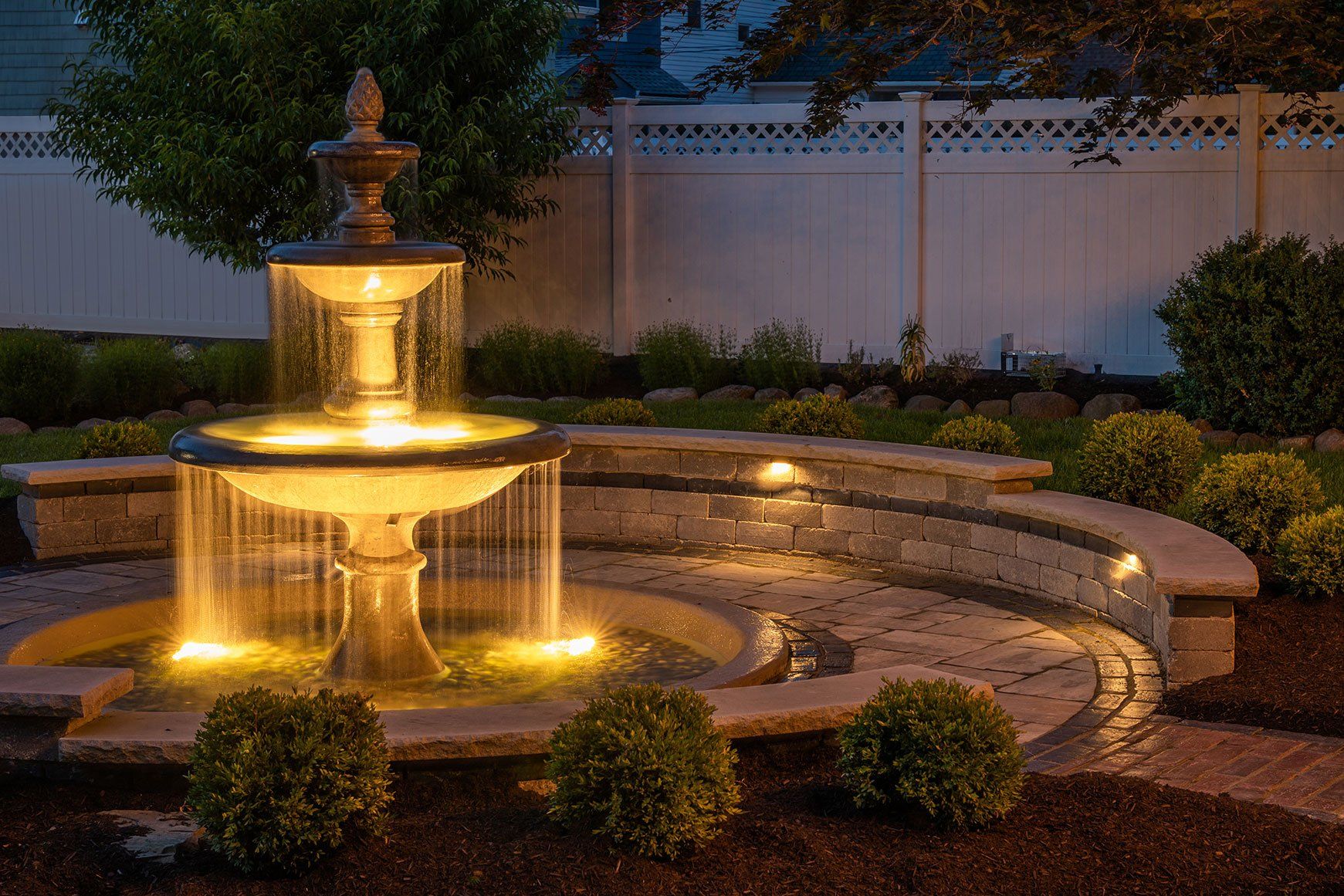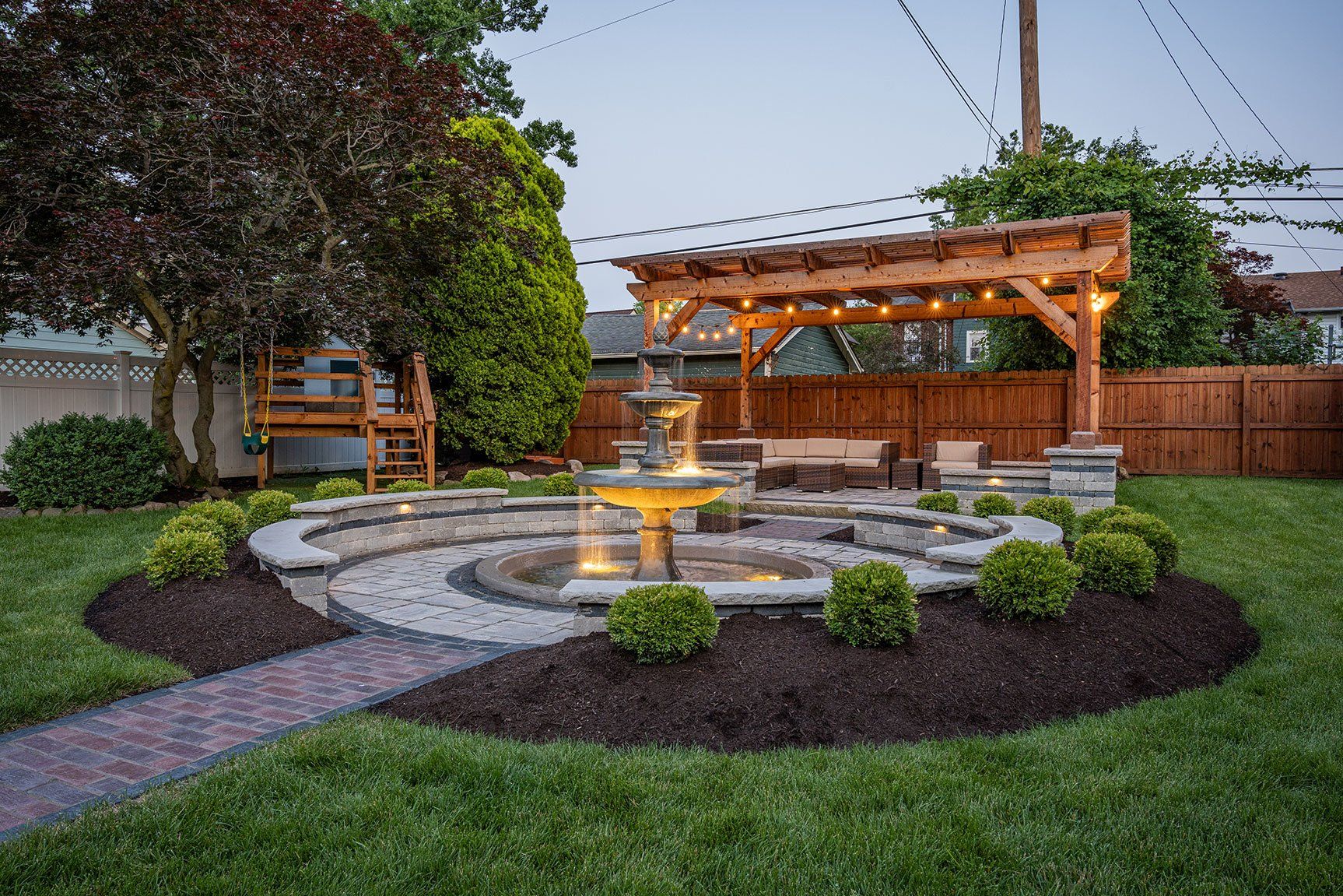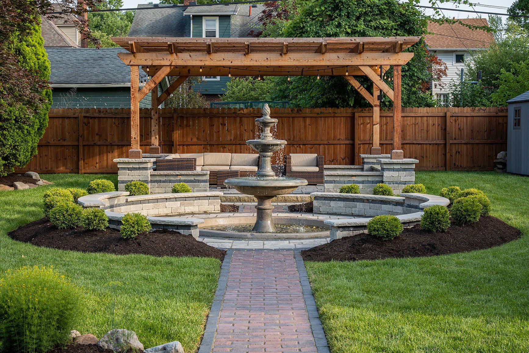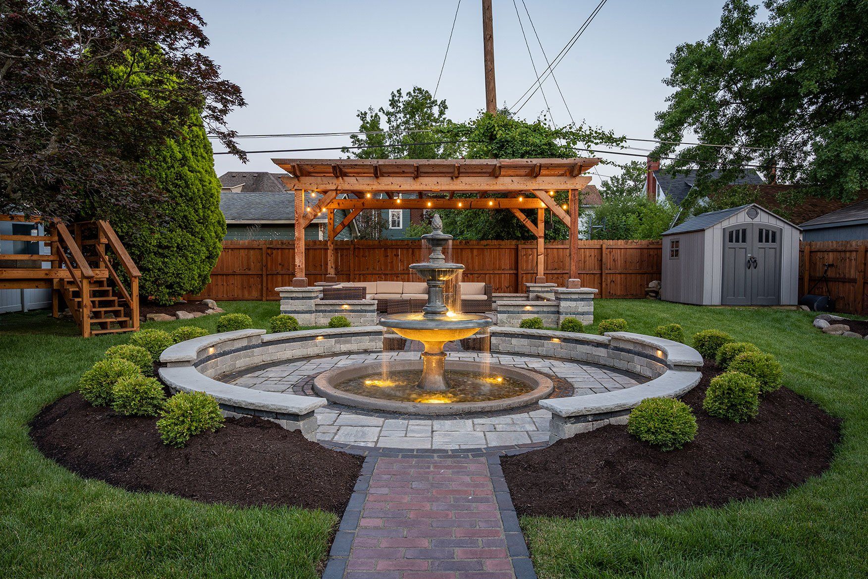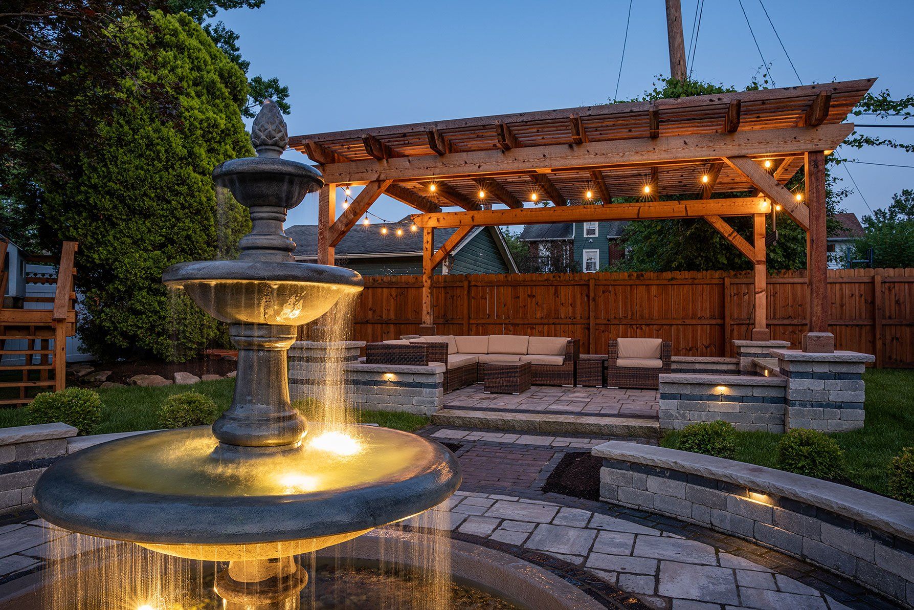 This beautiful project includes a permeable patio, fountain water feature, seating walls, an upper level patio nestled under a cedar pergola, under cap landscape lighting, water fountain lighting, landscape plantings, and sod.
