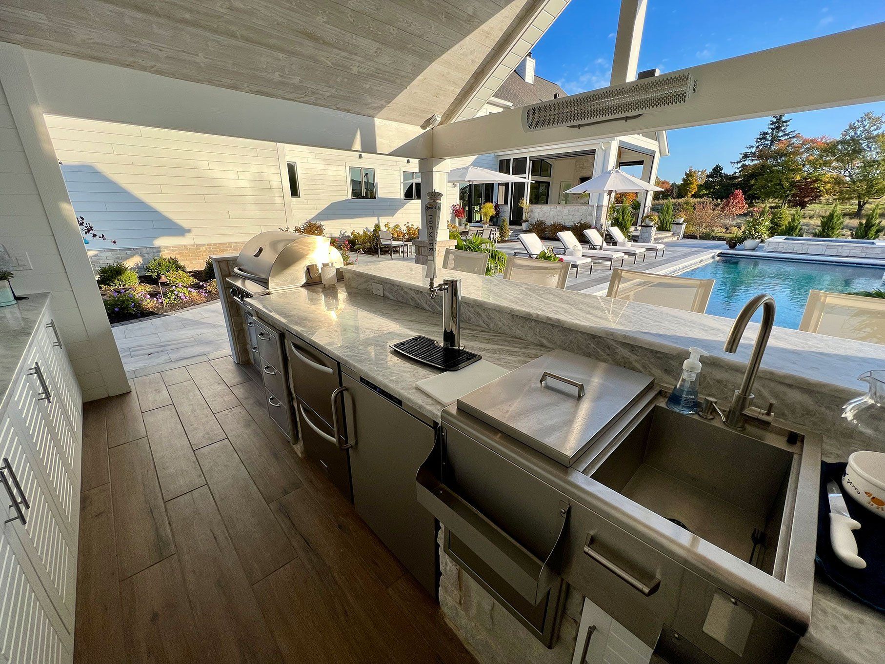 They brought an indoor product to the outside by blending different colors, styles, and textures. Using porcelain in the covered areas, such as the three-season room, front entrance, and pool deck, gave each area their own unique feel and vibe.