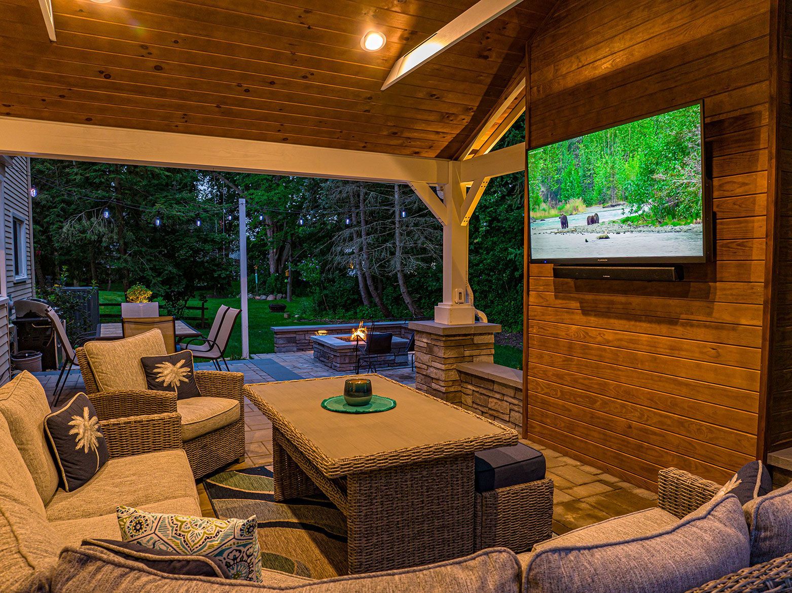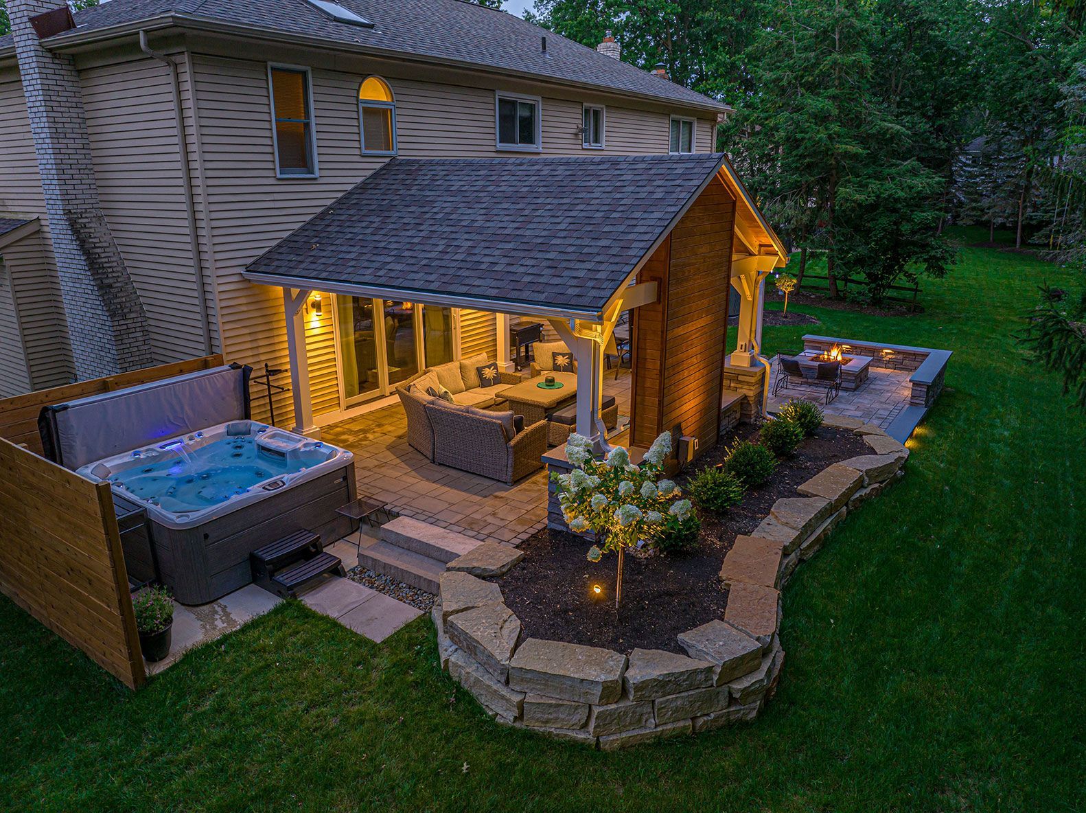 What used to be an old, rotting deck, has been transformed into one of the most cozy outdoor living spaces you will see in Westlake! With limited space, this feature packed space has an exquisite blend of Techo Bloc seat walls, pillars, pavers, borders & steps that blends seamlessly with a natural stone boulder retaining wall to combat the harsh sloping terrain of this backyard. This multi-tiered living space is accentuated with a natural gas fire pit, seat walls, lighting to highlight steps and tiers and a custom pavilion. This one-of-a-kind pavilion is highlighted with stone pillars and seat wall, custom floor-to-ceiling tv wall & a finished cedar tone tongue & grove ceiling. Along side this stunning patio sits a large hot tub area with privacy fencing. Whether you are looking to lounge and watch some tv, grill, sit tight by a cozy fire, enjoy a meal at the dining table or relax in the hot tub, this outdoor living space has it all!!!