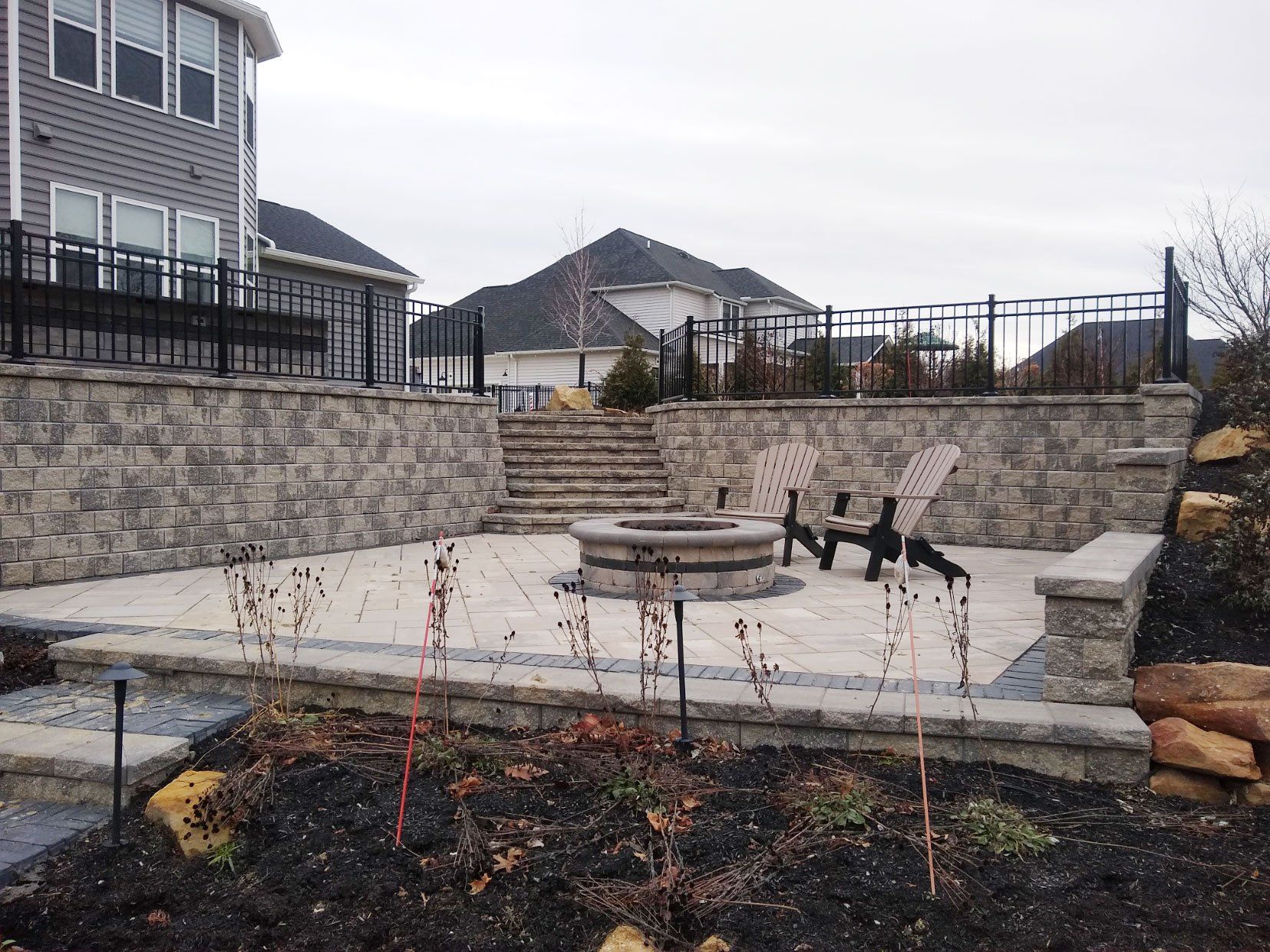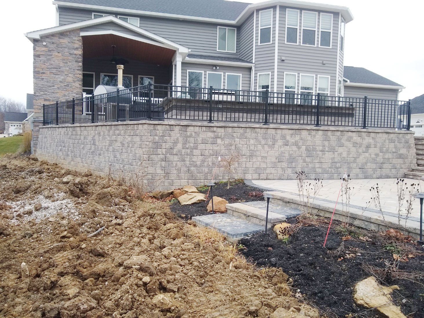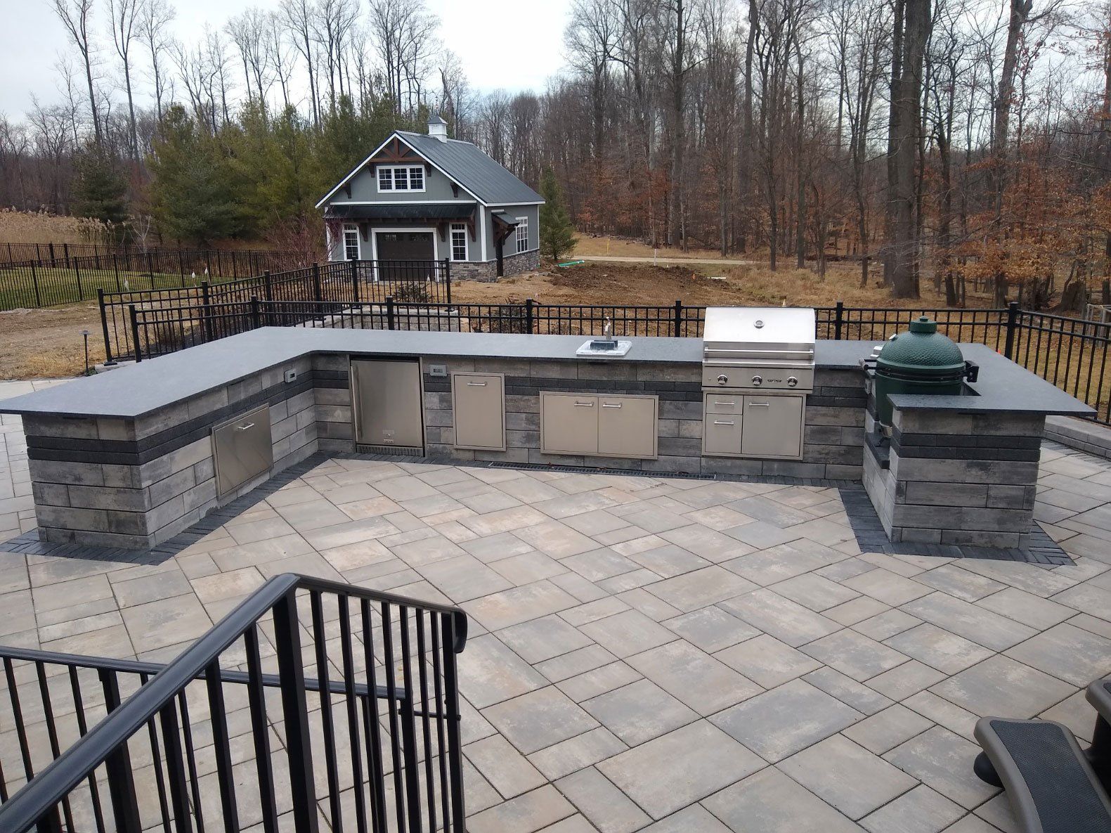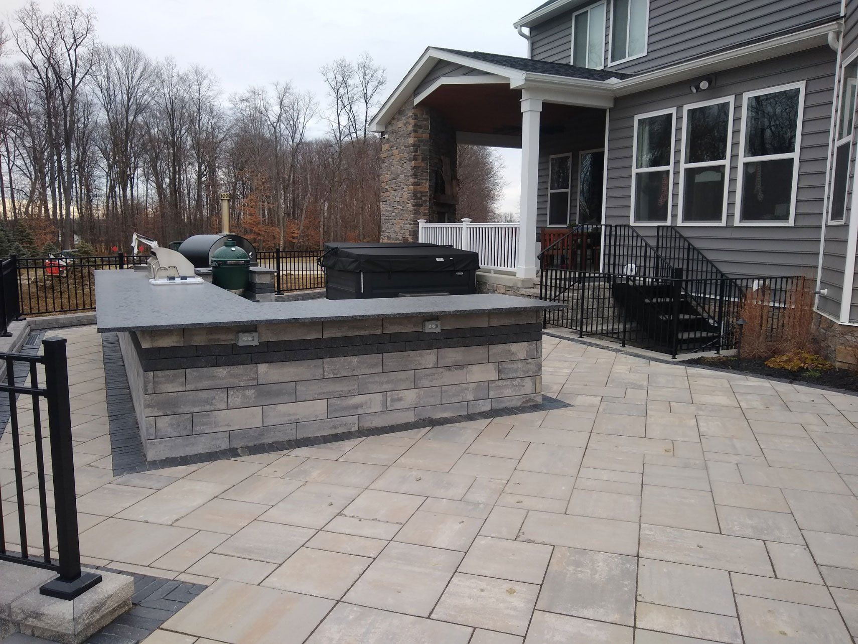 This client wanted to flatten a 6' change in the builder's final grade to have an extensive outdoor kitchen - complete with a grill, side burner, Green Egg, sink, trash, outdoor refrigerator, and storage. They also wanted space for a hot tub, gas fire pit, and access to their basement level instead of the egress window.