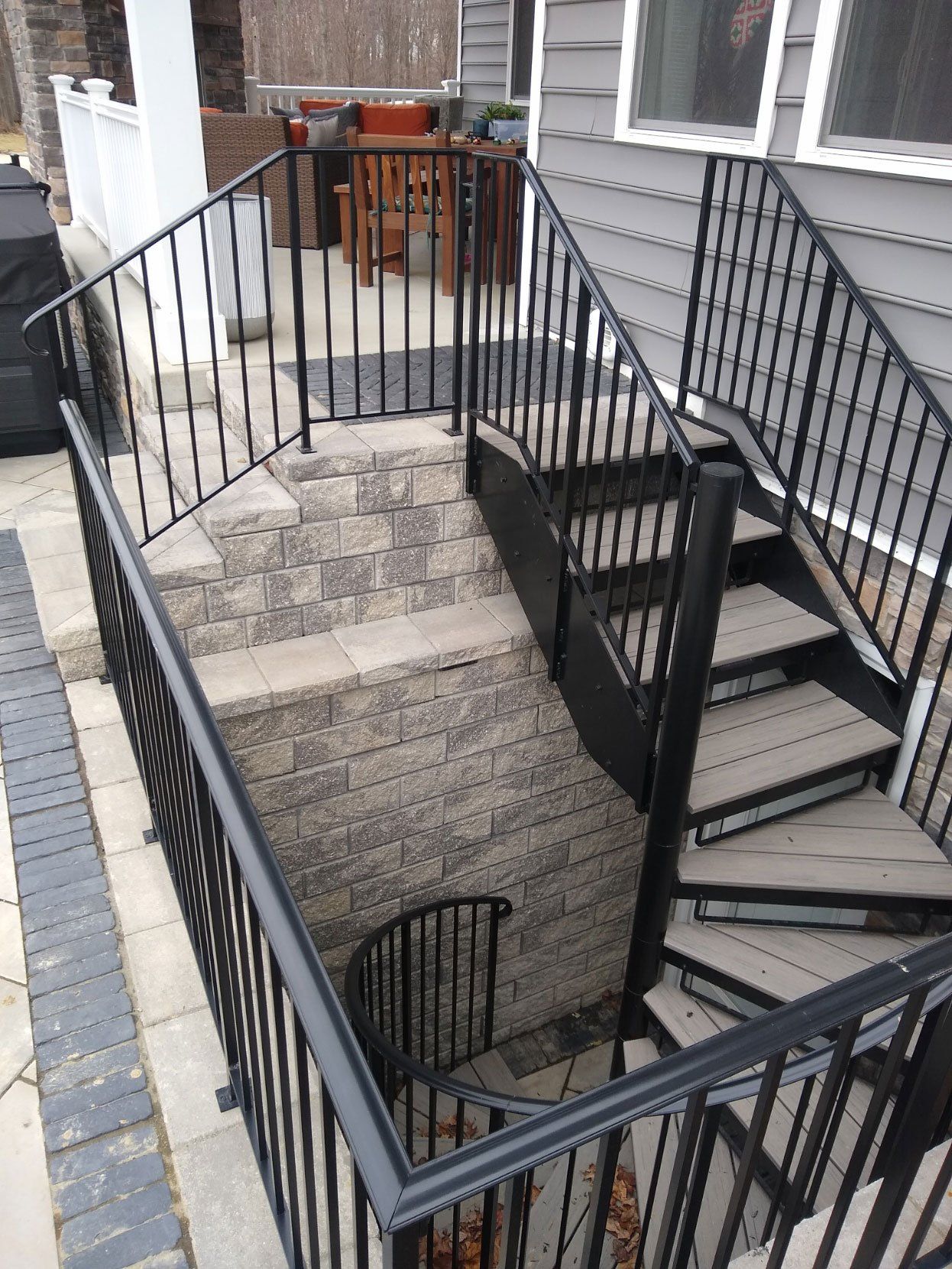 Materials include Unilock U-Cara kitchen, Pisa II retaining walls, Beacon Hill Smooth pavers with Copthorne Basalt accents, Brussels fire pit, Delta Heat grill and applicances, a spiral staircase, railings, and lighting.