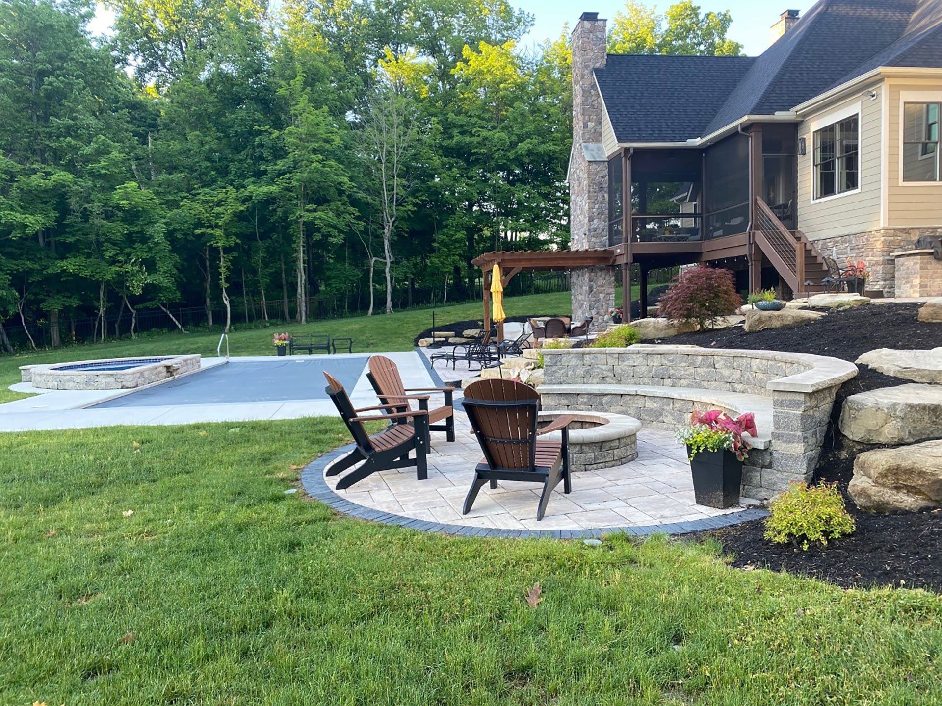 This multi-phase residential project in Hinckley was completed in 2022. It includes a fire pit area encompassed by a seating wall and poly outdoor furniture. A custom pergola is attached to an existing deck that overlooks the hot tub encased with paver wall block, while a grill island with limestone countertop and built-in grill anchors the project on the top tier patio. Materials used: Unilock Estate Wall, Brussels Dimensional, Beacon Hill and Copthorne pavers and wall block, sandstone boulders, built-in Blaze grill, and Berlin Gardens pergola.