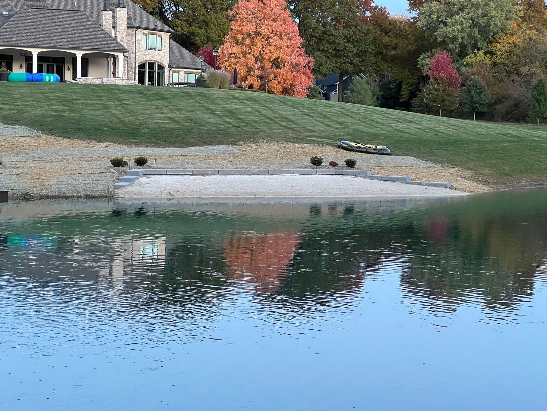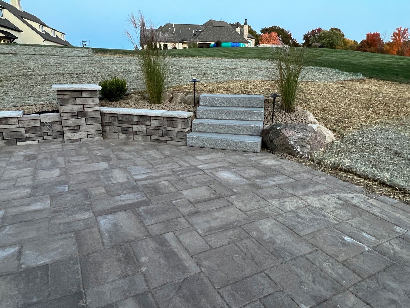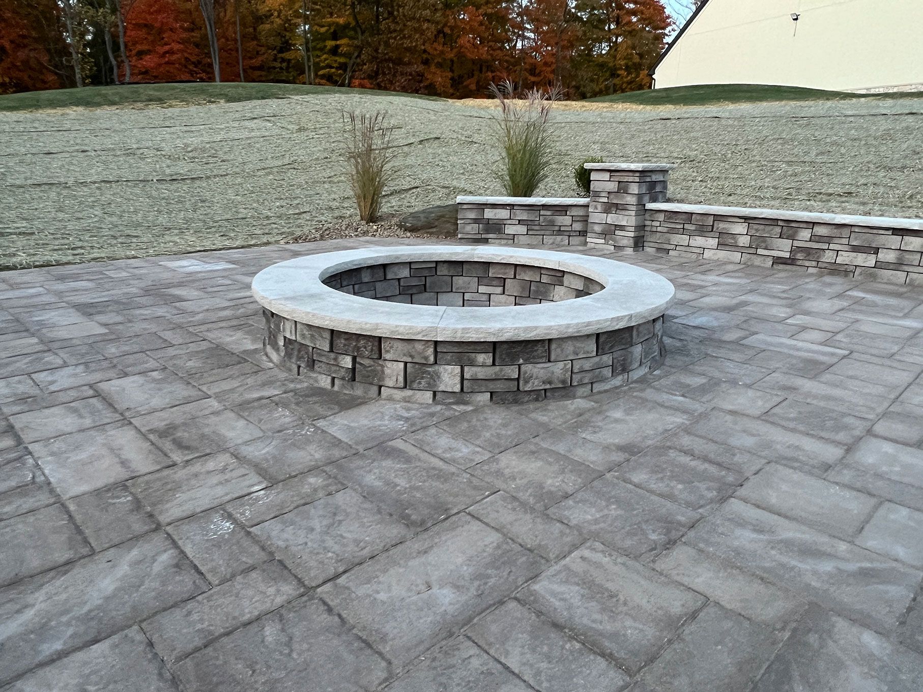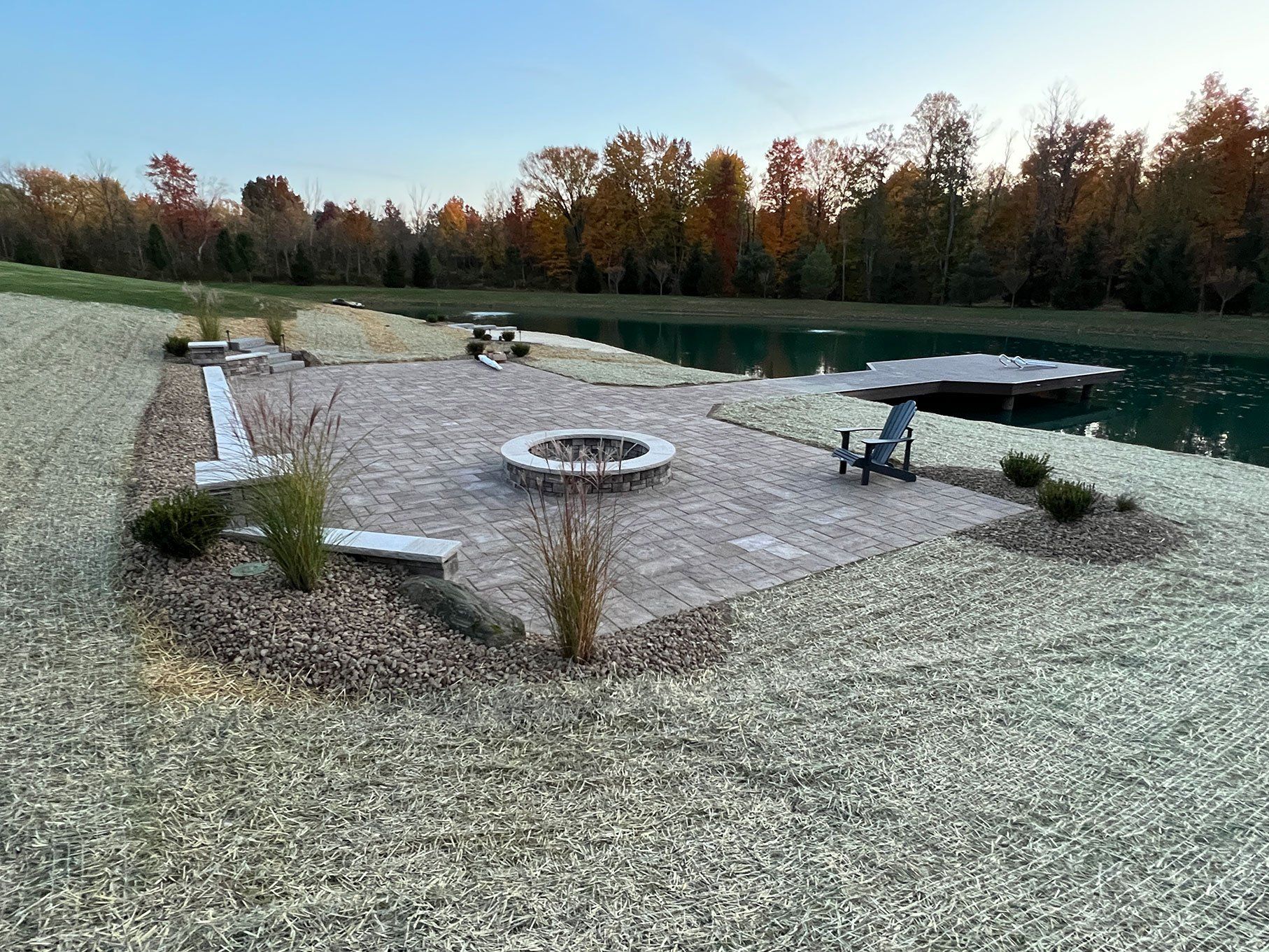 Landscape Transformations installed this fire pit paver patio on the shore of their client's pond. Techo-Bloc Slate Blu 60 in Chestnut Brown was used for the pavers, while Prescott Rock Garden Brown was used for the seating wall and fire pit. Unilock Siena Stone was used for the steps.