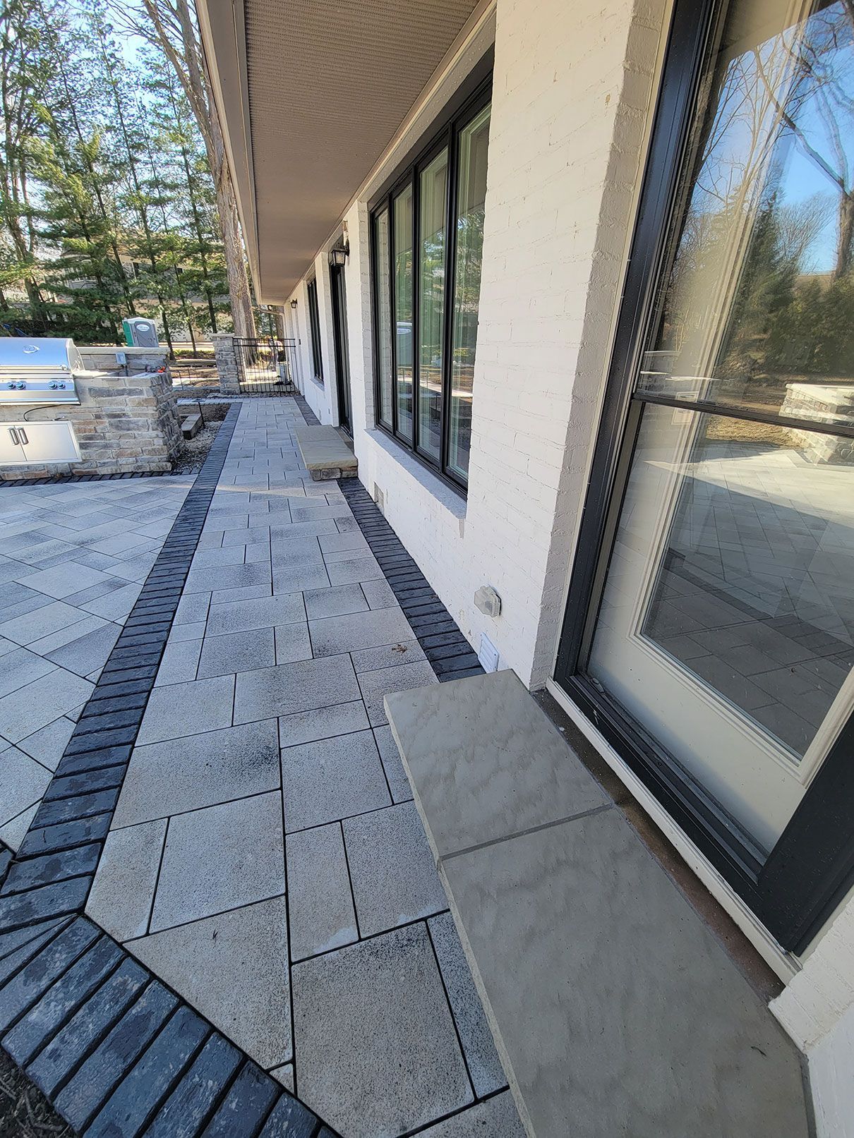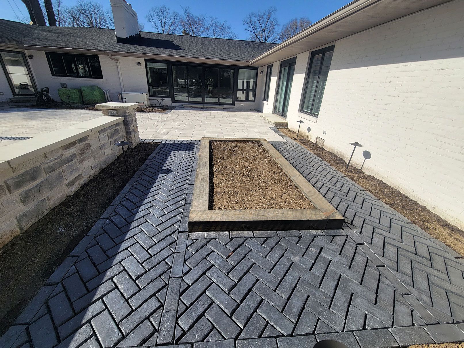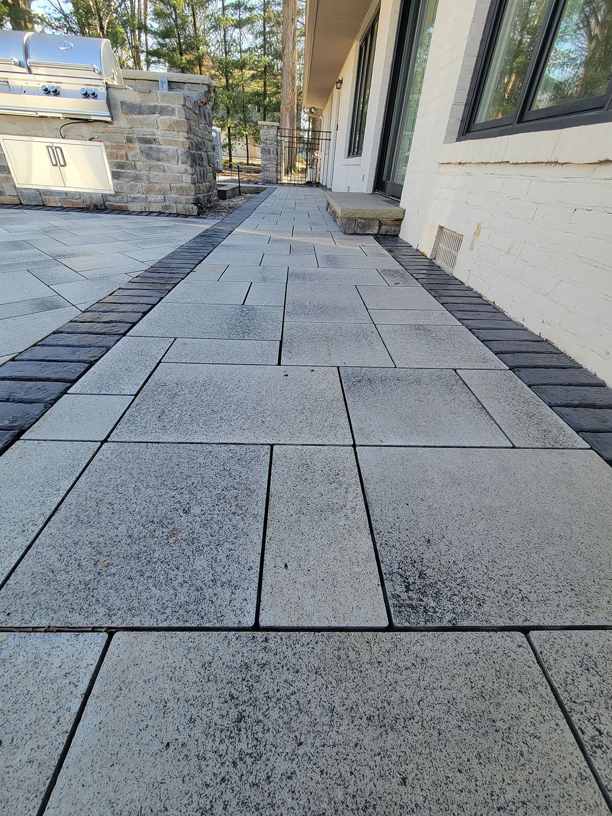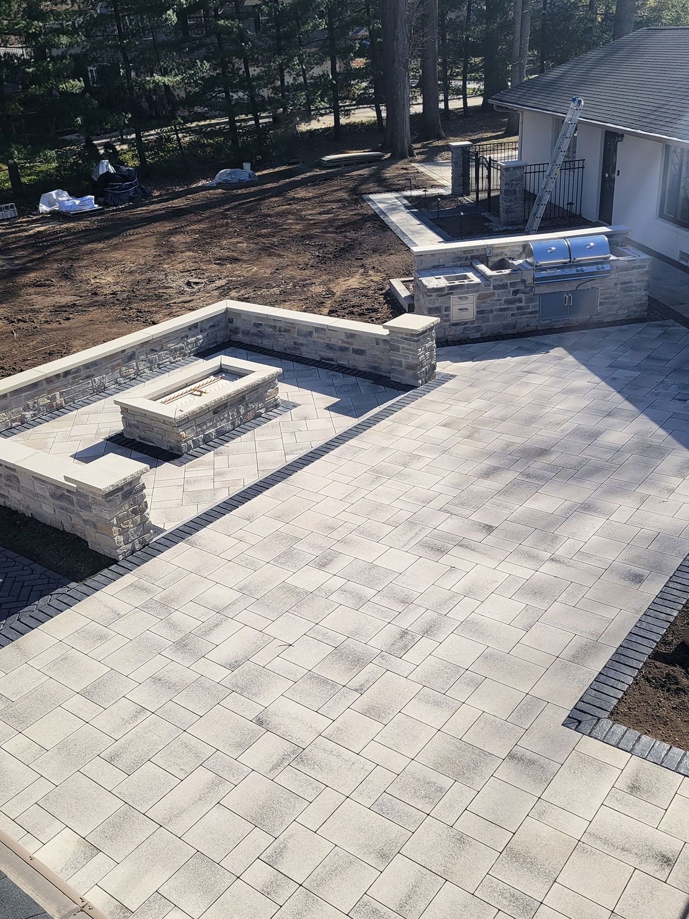 The Morton team removed an old, small, and outdated patio from their client's backyard, and redesigned and installed an entirely new outdoor living area! This project was a referral and Morton's customer gave them the trust and freedom to select the products used. The project included installation of a grill island and pizza oven, along with a gas firepit surrounded by seat walls and accent columns. Flow throughout the entire project from the driveway to the backyard was important, so the sightlines and textures of the pathways and patios were given immense consideration and attention.