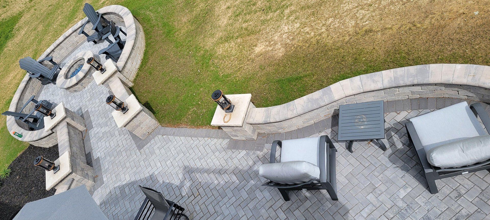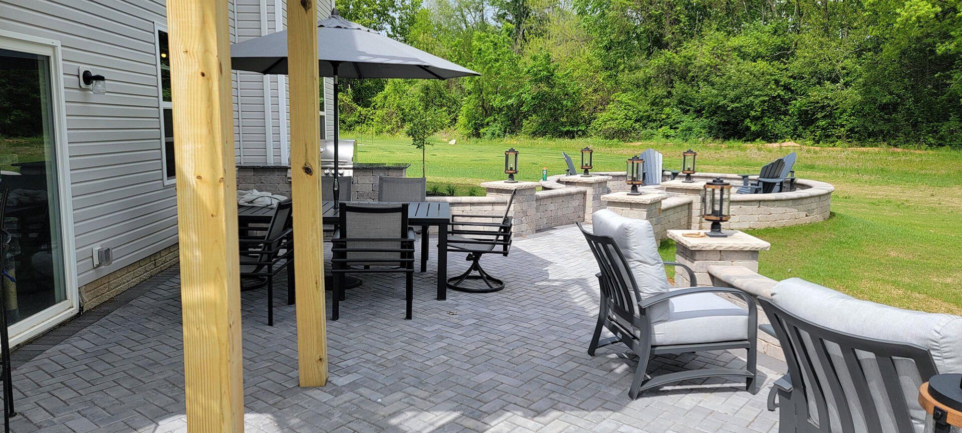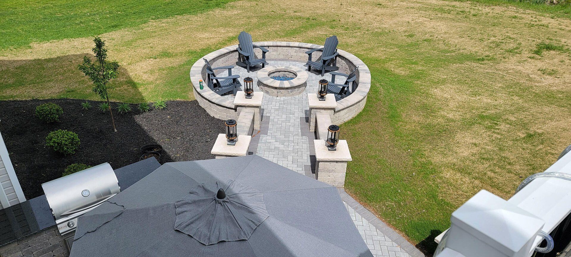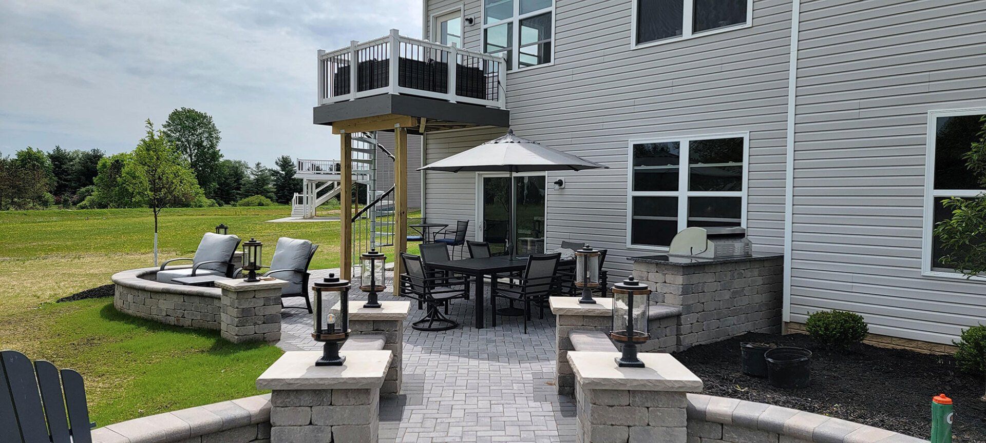 This project includes a fire pit, grill island with Blaze grill, Unilock Holland Premier herringbone paver patio, and a Brussels Dimensional seating wall. A Trex deck with a spiral staircase was also installed.