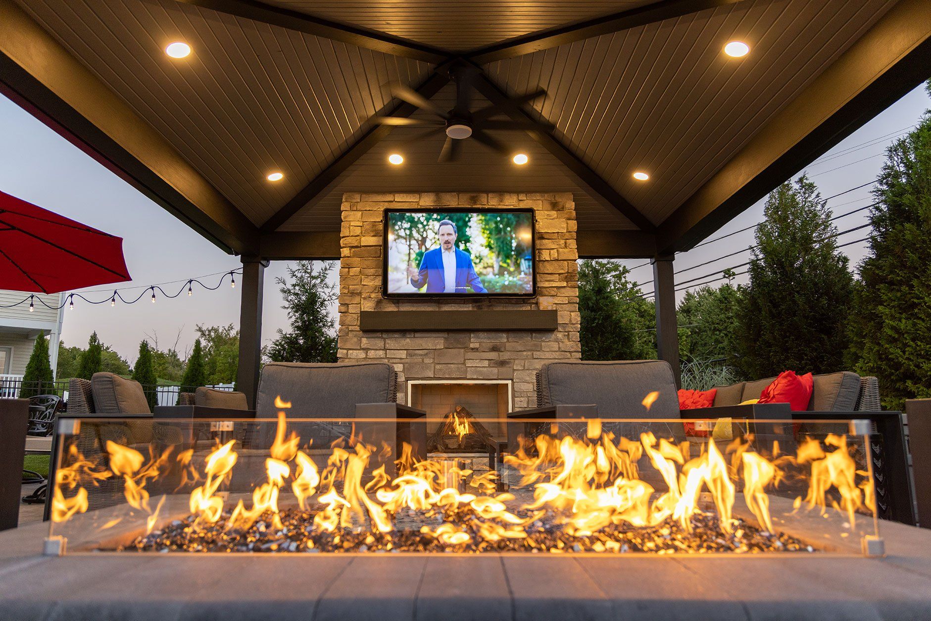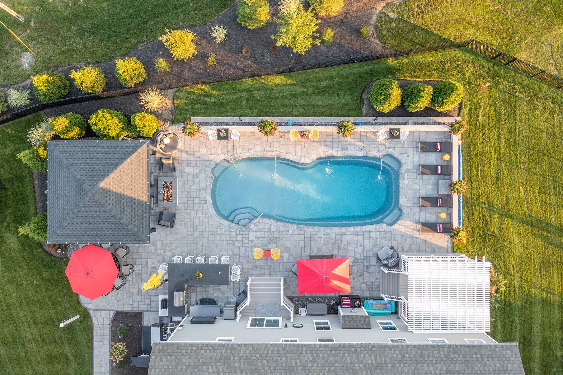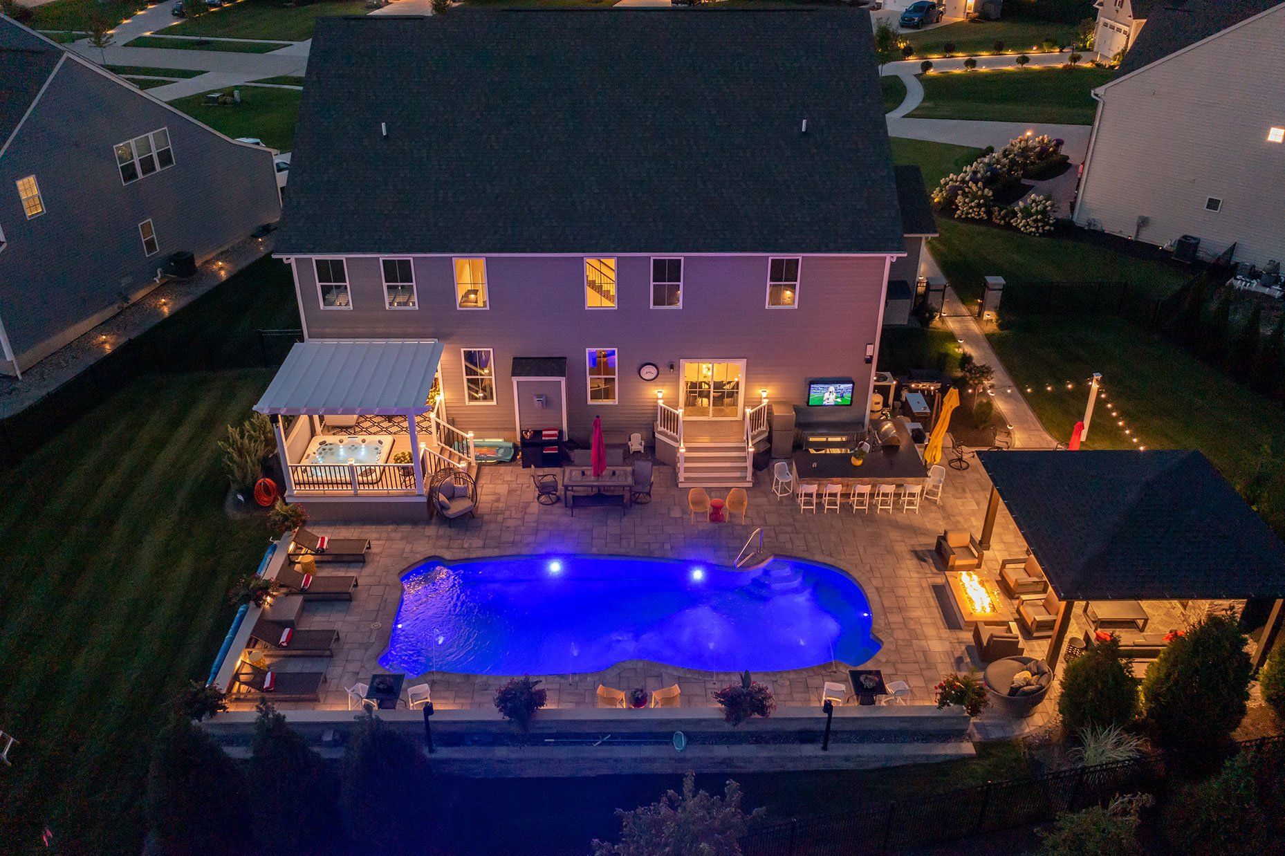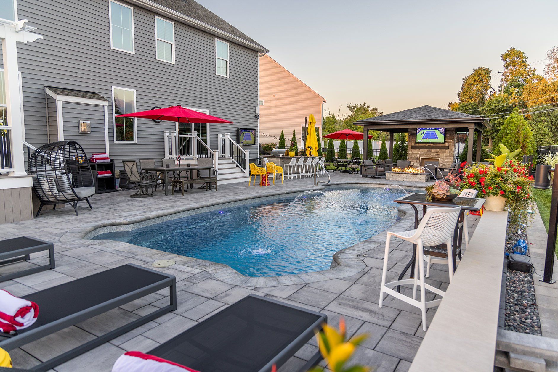 This project included a large Unilock Beacon Hill and Artline paver patio, structure with a gas fireplace and fire pit, outdoor kitchen, pergola, Azek deck, pool, Unilock retaining wall, new landscape and yard, fence, and new front porch. Low voltage landscape lighting was also added throughout.
